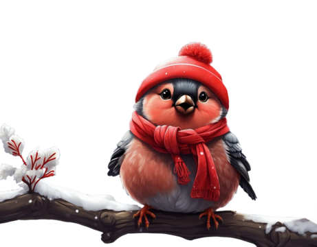 Winter wildlife closeup bullfinch on branch snowy environment nature isolated on transparent background png