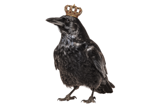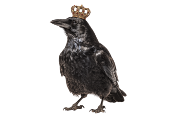 A Halloween raven wearing a crown, isolated on a transparent background.