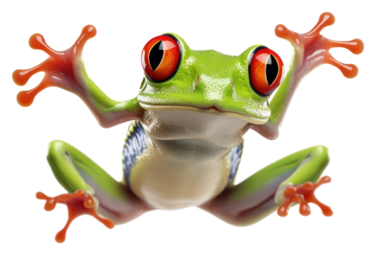 Isolated Green Frog Leaping, Bullfrog Showing its Webbed Feet and Legs on Light Backdrop
