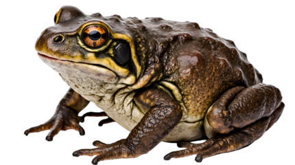 A majestic, life-like American Bullfrog, Lithobates catesbeianus, sitting attentively. Isolated on Transparent and White Background
