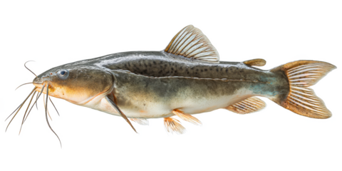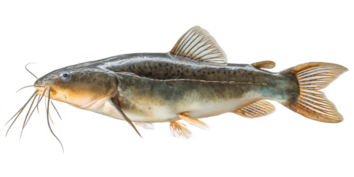 Calm brown catfish with long whisker isolated on plain background. This freshwater fish element perfect clipart for aquatic, wildlife, and nature designs