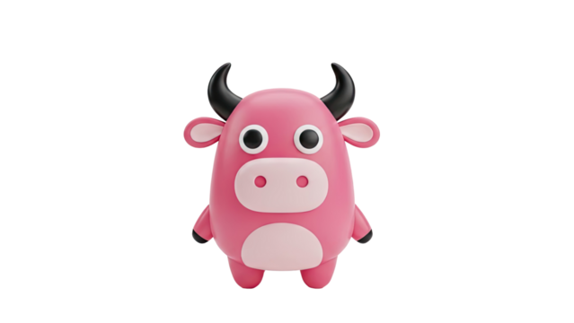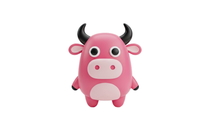 3D Cute Pink Cartoon Cow with Black Horns and Big Eyes on transparent background