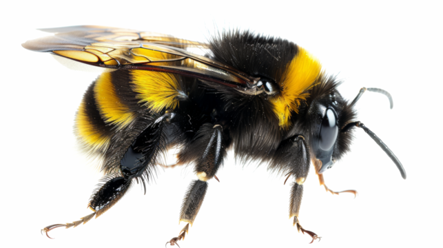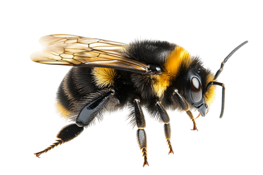 Close up view of a bumble bee with transparent wings isolated on a black background in detailed focus on transparent background