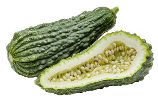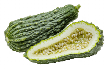 Fresh bumpy pickling cucumber cut in half revealing crisp white flesh and seeds for food design on transparent background