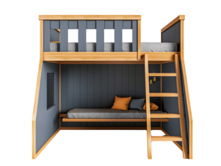 Wooden bunk bed with storage drawers on transparent background