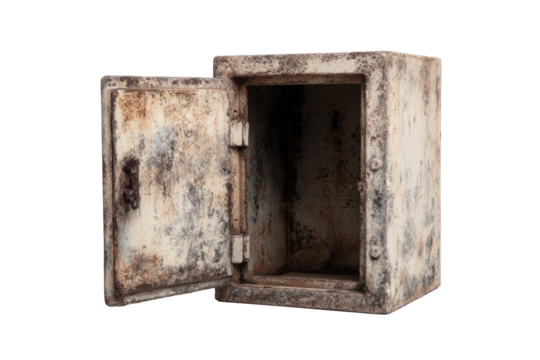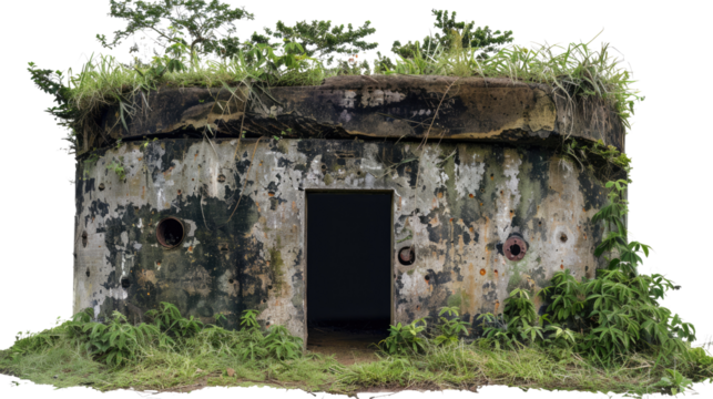 Concrete military bunker structure with cracks and moss growth on transparent background