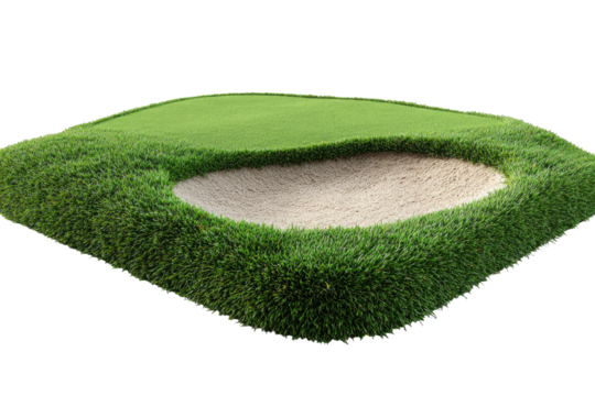 Lush green golf course with smooth hills and sand bunker isolated clearly on a bright white background