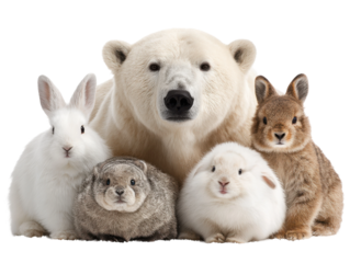 Polar bear and rabbits together arctic animal portrait playful scene. Isolated on transparent background, png.