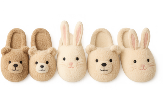 Cozy animal slippers, including fluffy teddy bear and bunny designs, offering warmth and comfort for home use on transparent background