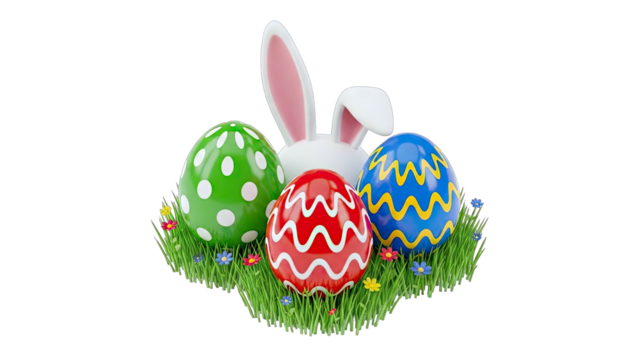 Easter Bunny and Eggs: A charming illustration of an Easter bunny nestled among beautifully decorated Easter eggs in a grassy field, evoking a sense of springtime joy and celebration.
