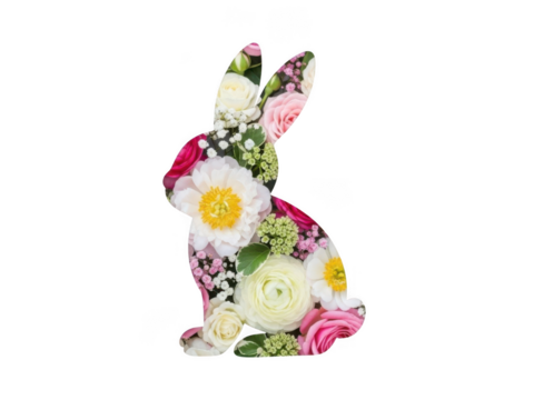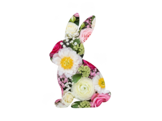 Floral easter bunny silhouette with vibrant flowers and greenery isolated on transparent background