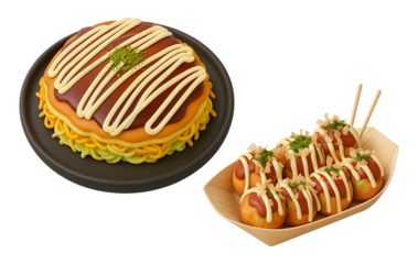 3Dクレイ風の可愛いお好み焼きとたこ焼きのセット|大阪名物・粉ものイラスト素材