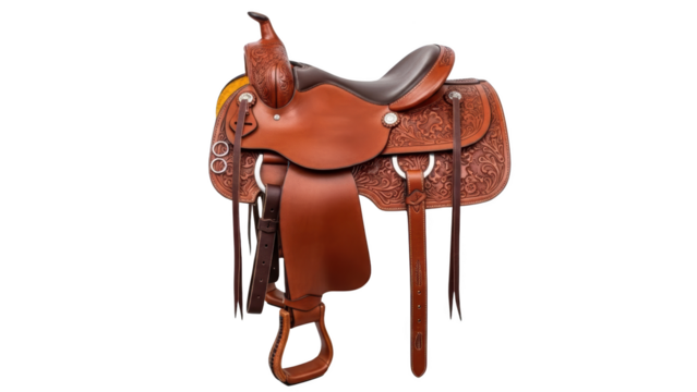 Western style leather horse saddle with stirrups isolated on transparent background