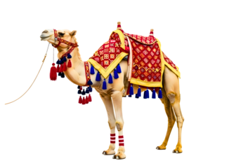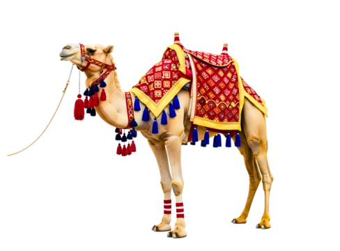 Ornate camel figurine with colorful saddle isolated on white background