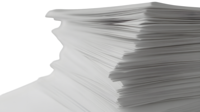 Tall stack of documents and papers isolated on a transparent background