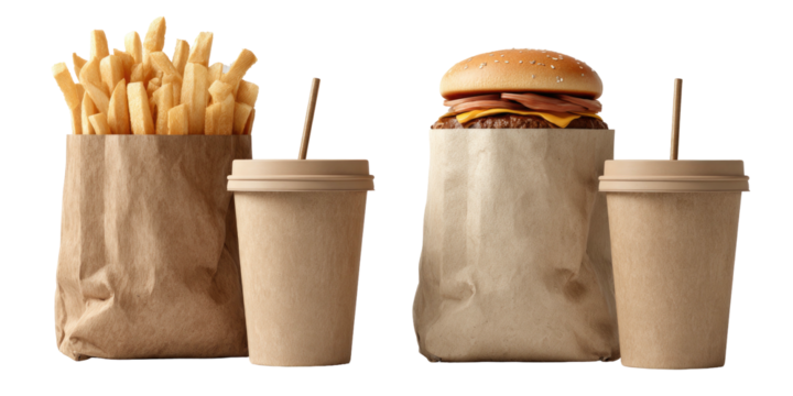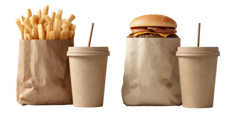 Delicious burger meal with fries and drinks in brown paper bags