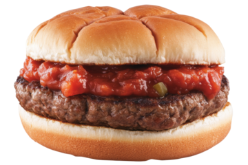 Mouthwatering Manwich A juicy burger topped with rich tomato sauce nestled between soft buns against a stark white background