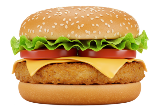 Isolated Studio Shot of Chicken Burger with Fresh Lettuce Tomato and Pickle on Transparent Background