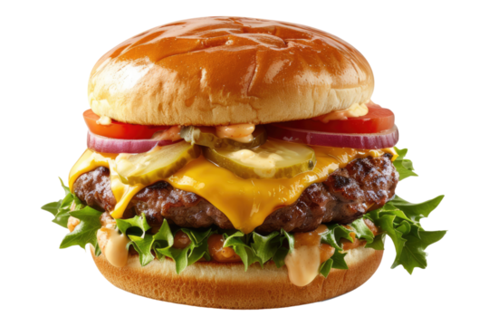 Juicy beef burger with cheese fast food restaurant delicious isolated on transparent background