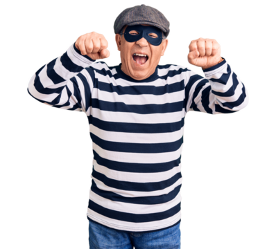 Senior handsome man wearing burglar mask and t-shirt angry and mad raising fists frustrated and furious while shouting with anger. rage and aggressive concept.