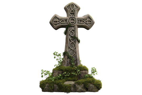 Weathered Celtic Cross Monument with Green Moss Vector Isolated on Transparent Background PNG