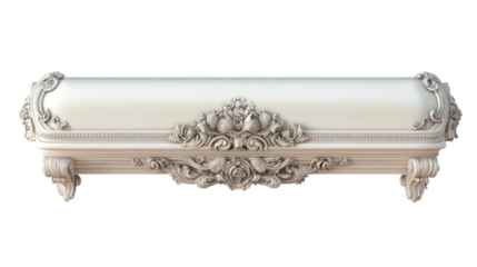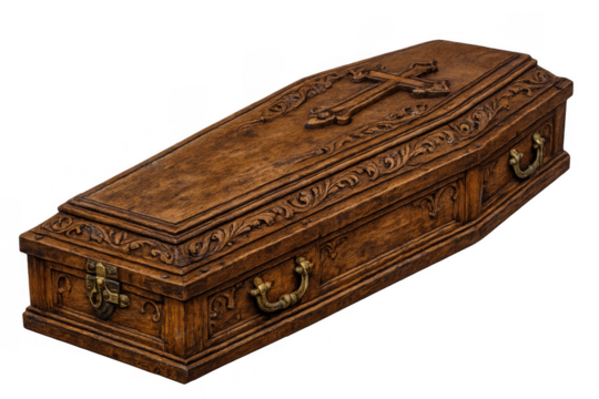 Ornate wooden coffin with carved cross and decorative handles, symbolizing death, funeral, and burial rituals