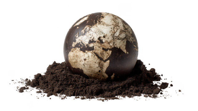 Ball bearing partly buried in dry soil, showing industrial machinery component degradation, transparent background
