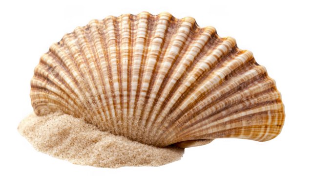 Detailed close up of a textured seashell half buried in fine sand isolated on transparent background