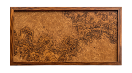 The image shows a rectangular frame of dark wood enclosing a piece of burl wood with striking swirling grain patterns in shades of brown.