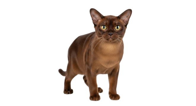 Isolated Burmese cat breed with copper-colored coat standing confidently upright indoors