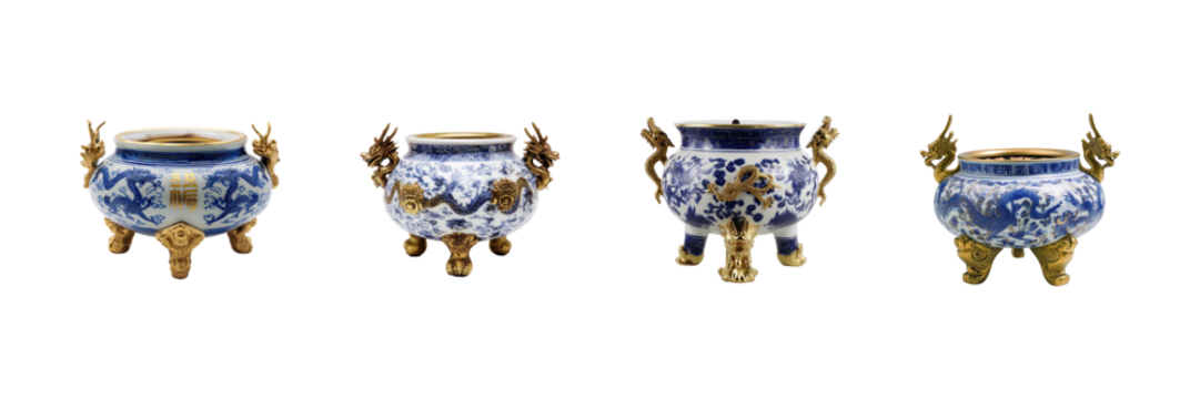 Blue And Porcelain Dragon Incense Burners Set. Traditional Chinese Art Collection Isolated On Transparent Background