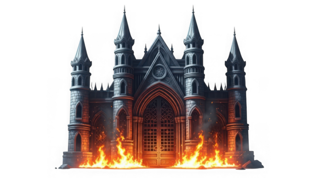 Rustic brick fireplace with glowing fire isolated on transparent background