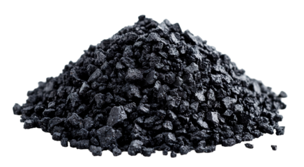 Pile of crushed black charcoal pieces, isolated on transparent cutout background