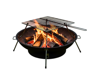 Outdoor fire pit with grill grate and burning logs isolated on transparent background