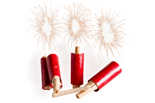 Bundle of red firecrackers tied with string, creating a dangerous explosive device, isolated on transparent background