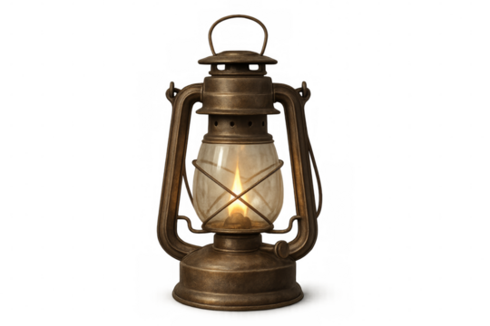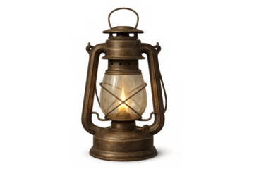 Old, rusty kerosene lantern burning brightly against a transparent background, evoking a vintage atmosphere filled with warmth and nostalgia, perfect for adding a rustic touch to any scene