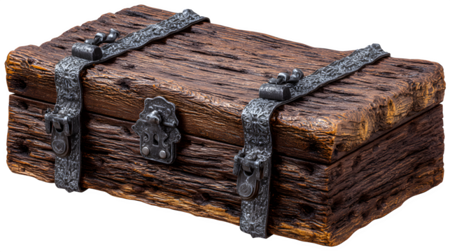 A storage box made from burnt wood with metal latches, isolated on a transparent background.