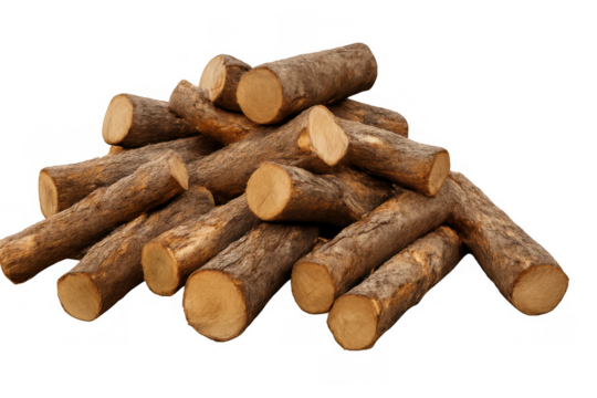 A neatly stacked pile of firewood logs their natural textures and colors. set against a plain white background. ideal for use in home decor or outdoor activities