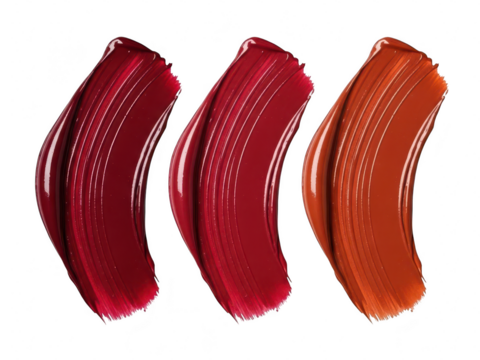 Three vibrant, glossy lipstick or makeup swatches showing deep red, bright red, and burnt orange shades isolated on transparent background