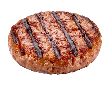 Grilled burger patty with grilled mark isolated on transparent or white background