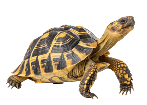 Detailed close-up of a starred tortoise with striking yellow and black shell patterns on a plain background