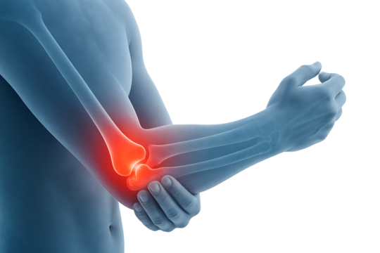 Human elbow joint experiencing pain and inflammation, medical concept of arthritis or injury, anatomical illustration