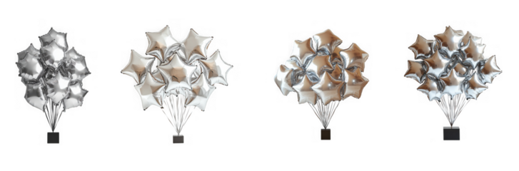 Clusters of starshaped balloons in silver and gold, bursting from a black base, isolated on transparent background