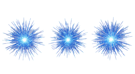 Three abstract vibrant blue light bursts with radiating lines against a transparent background with copy space, concept of celebration, energy and wonder