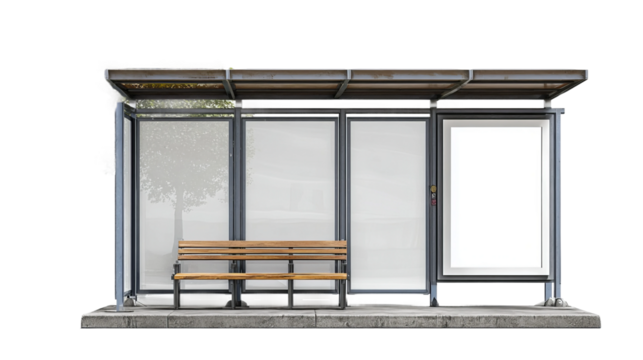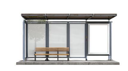Wooden Bus Stop Shelter Glass Exterior Design, Urban Park Seating for Public Areas, isolated on transparent background.