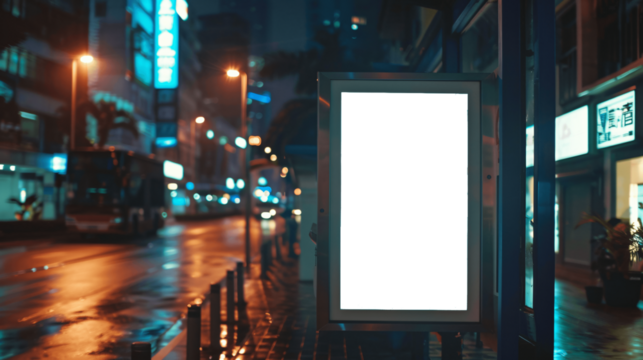 Blank white vertical digital billboard poster on city street bus stop, Generative AI.