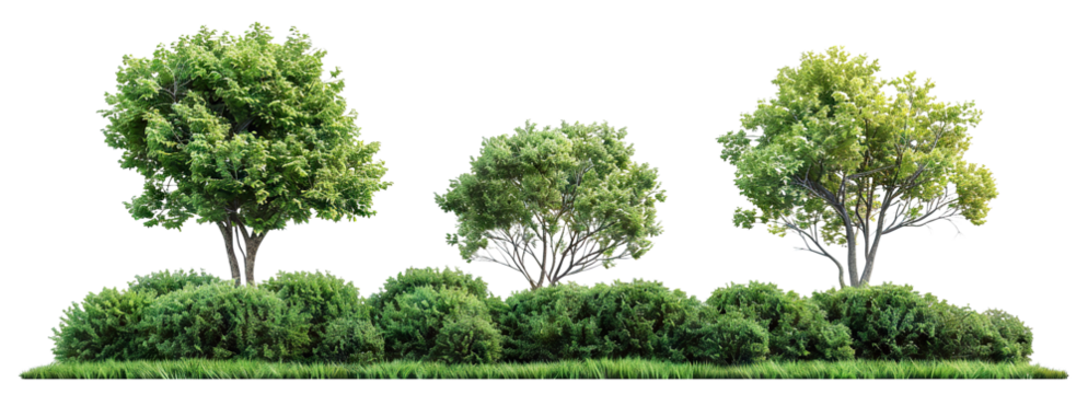 Cutout tree line. Forest and green foliage in summer. Row of trees and shrubs isolated on transparent background. Forest scape. High quality clipping mask