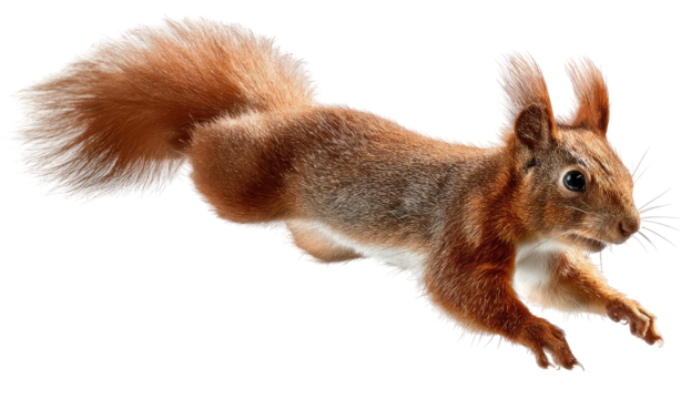 Energetic red squirrel with a bushy tail leaping gracefully in midair isolated on transparent background