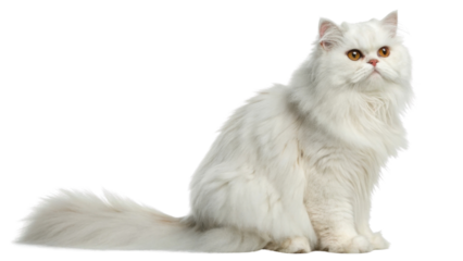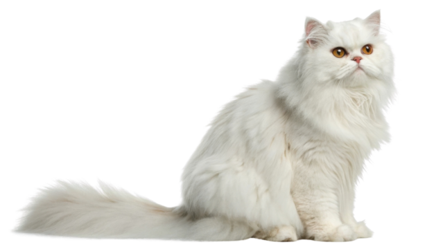 Fluffy white Persian cat with bright amber eyes sitting calmly showing its long fur and bushy tail in relaxed pose