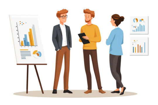 A stylized illustration of a diverse business team celebrating a successful goal with raised hands, confetti, and a positive growth chart on a laptop.